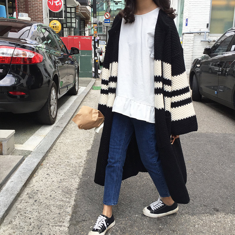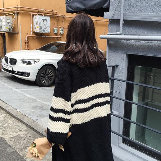 / 2017秋冬新款韓版女裝寬松大碼條紋針織衫毛衣中長款開衫外套女