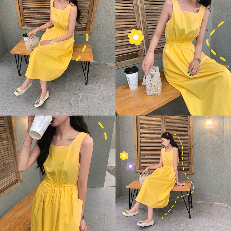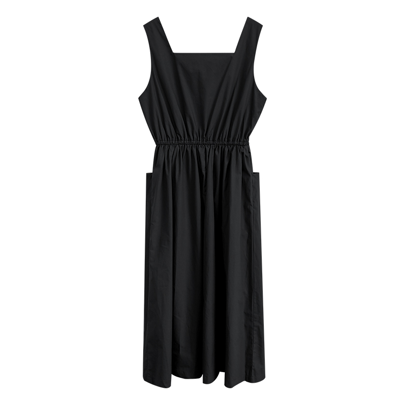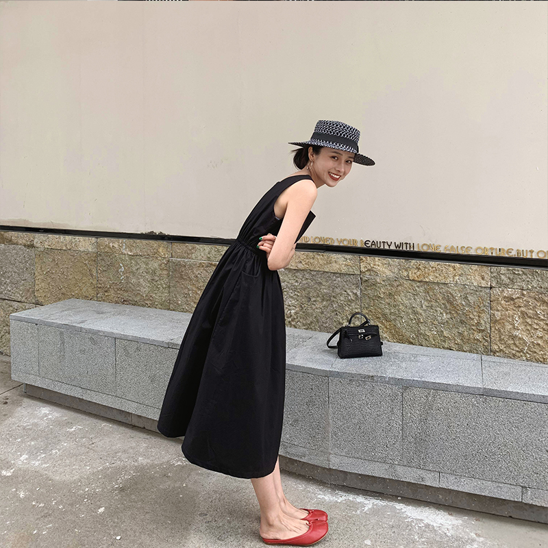 A7seven背心連衣裙女夏季中長款韓版收腰方領黑色無袖時尚A字裙