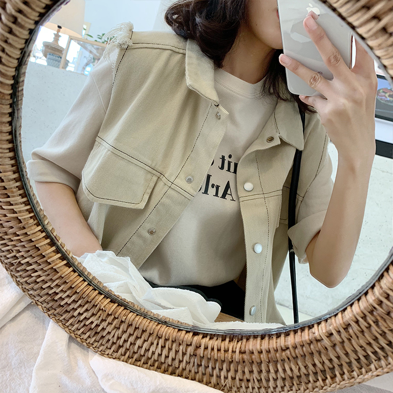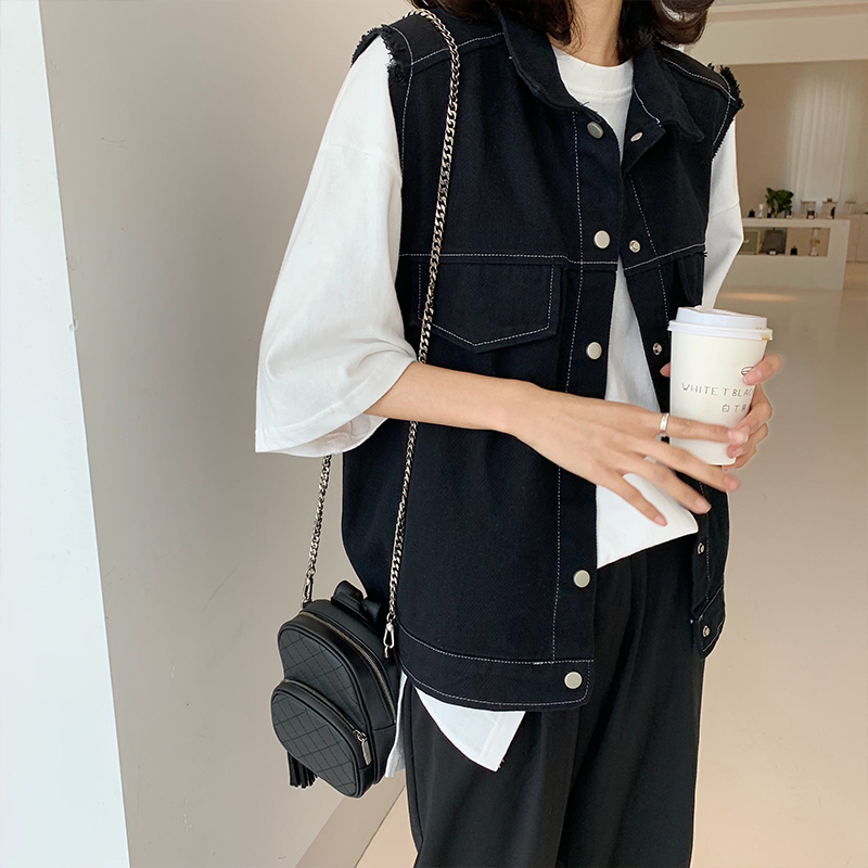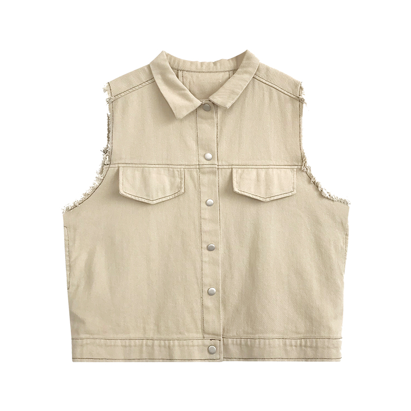 A7seven工裝馬甲女2019春裝新款毛邊卡其色polo領韓版顯瘦外套潮