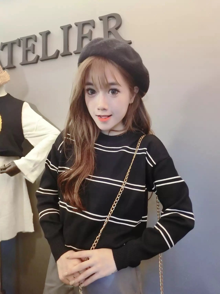 條紋套頭毛衣女秋冬長袖打底衫新款韓版學生半高領針織衫寬松