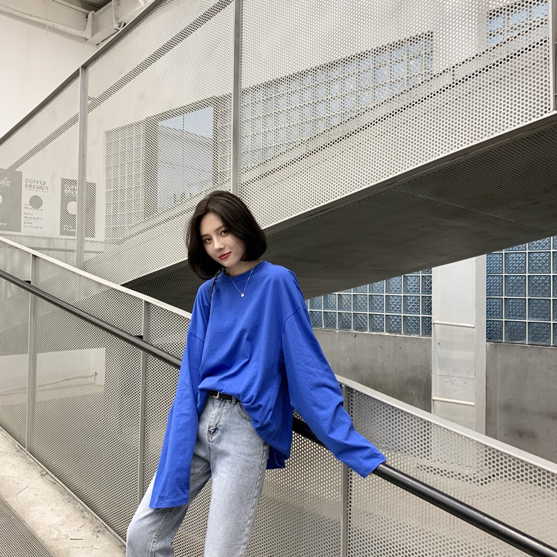 A7seven長袖T恤女2019春裝新款韓版圓領寬松顯瘦純色學生簡約上衣