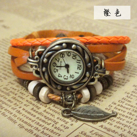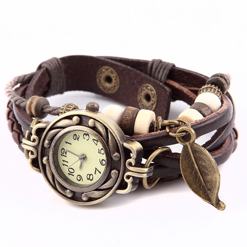 *【材質】:皮革表帶 木質鏈珠 合金樹葉吊墜 不銹鋼底蓋 石英機芯