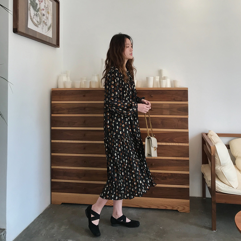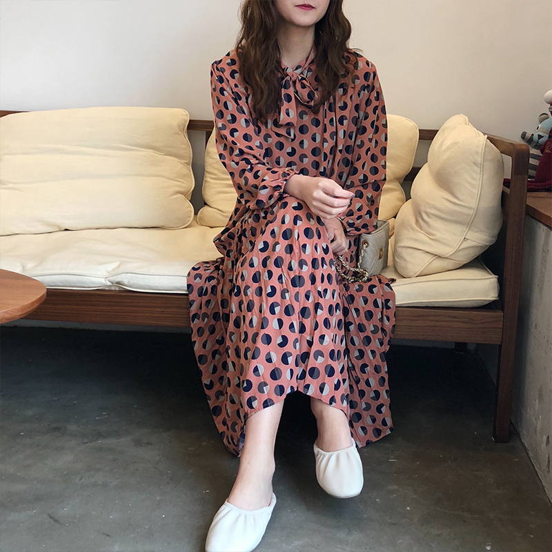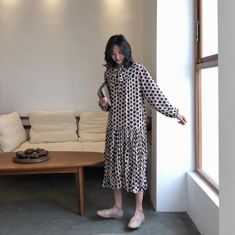 A7seven連衣裙女春A字中長款韓版寬松顯瘦長袖黑色雪紡系帶波點裙