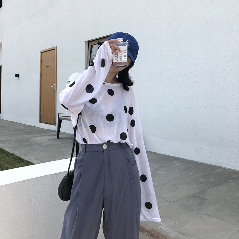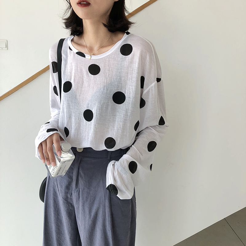 A7seven 波點寬松顯瘦春夏2019新款薄款圓領長袖T恤女休閑上衣潮