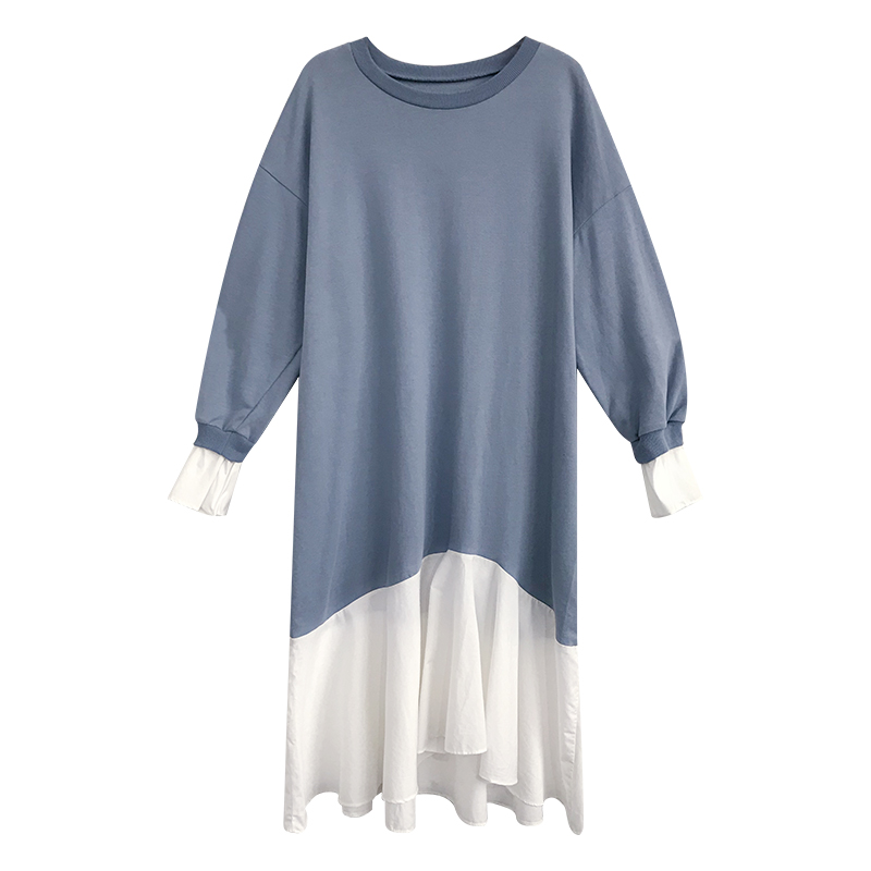 A7seven連衣裙女春夏新款韓版蝙蝠袖圓領寬松套頭拼接荷葉邊長裙