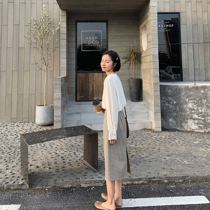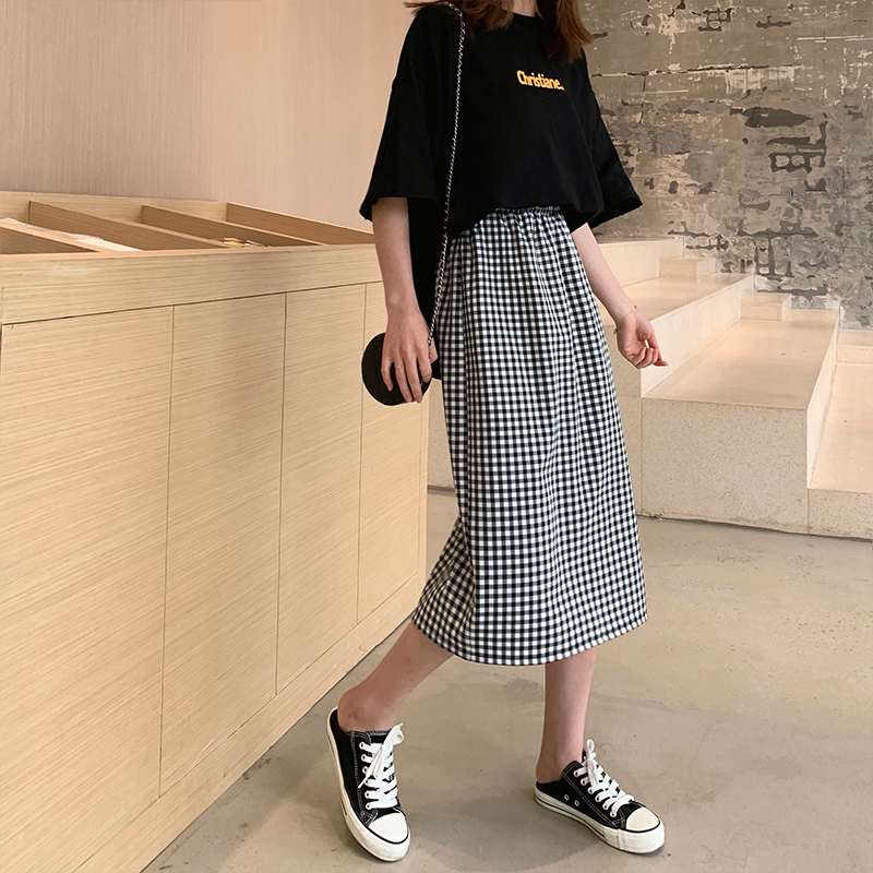 A7seven格子裙女春夏裝新款開叉A字韓版高腰寬松顯瘦中長款半身裙