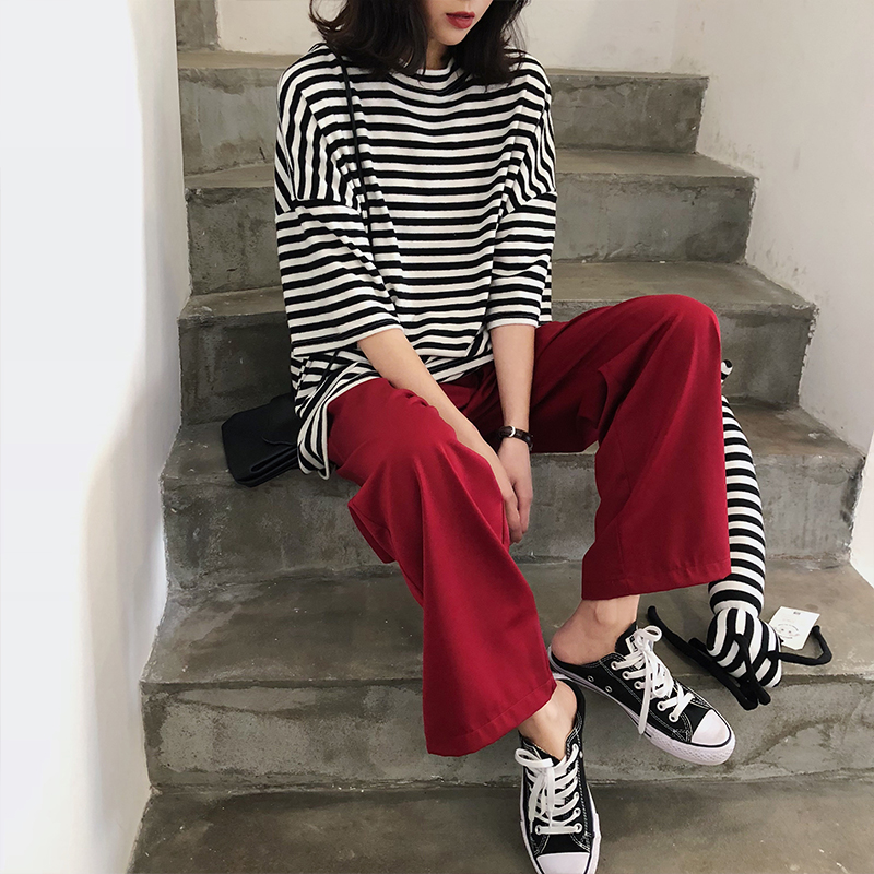 A7seven黑白條紋T恤衫女2019春夏裝新款短袖圓領磨毛韓版寬松顯瘦