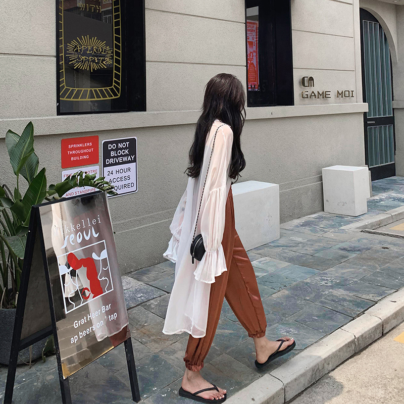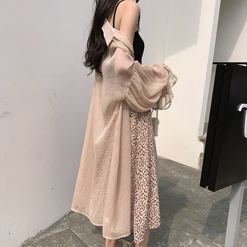 A7seven防曬襯衫女春夏裝中長款白色薄款韓版寬松顯瘦花苞袖襯衣