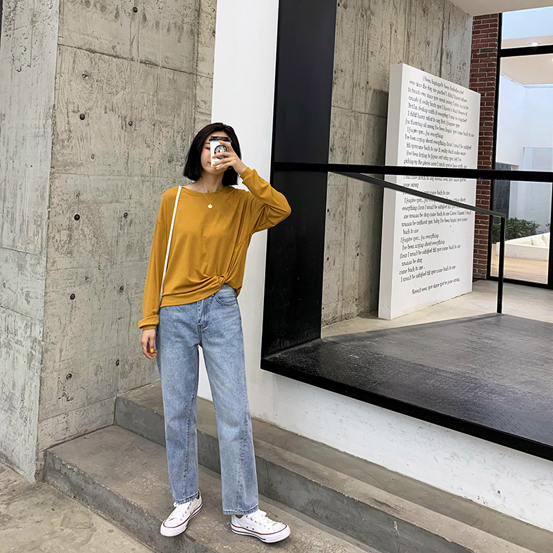 A7seven長袖T恤女春裝新款韓版交叉寬松顯瘦圓領純色簡約百搭上衣