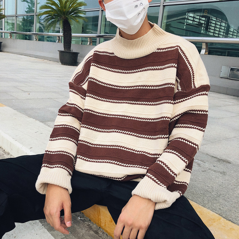 / 文藝男女店加厚學生毛衣冬季潮流半高領針織衫男士韓版條紋外套男