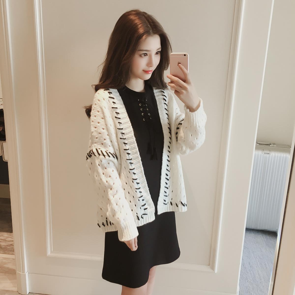 2017秋裝新款韓版鏤空長袖短款針織衫開衫女外搭薄款打底毛衣外套