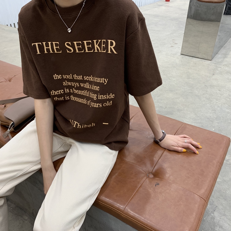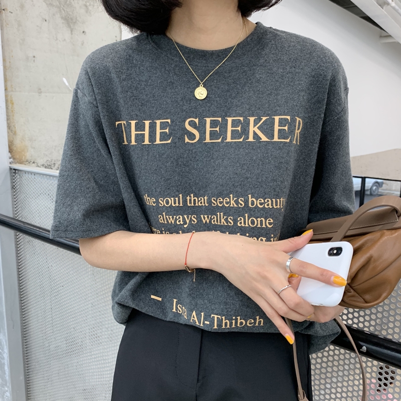 A7seven字母印花T恤女磨毛短袖春夏英文白色韓版寬松顯瘦圓領上衣