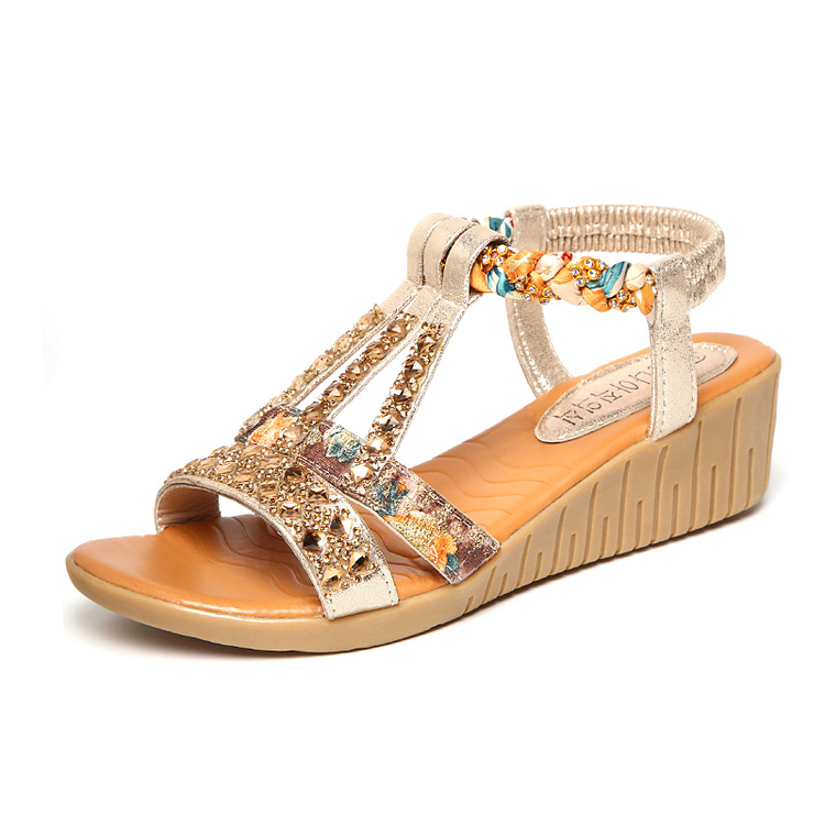 新款涼鞋女夏中跟舒適沙灘鞋水鉆厚底鞋子平底坡跟羅馬涼鞋潮