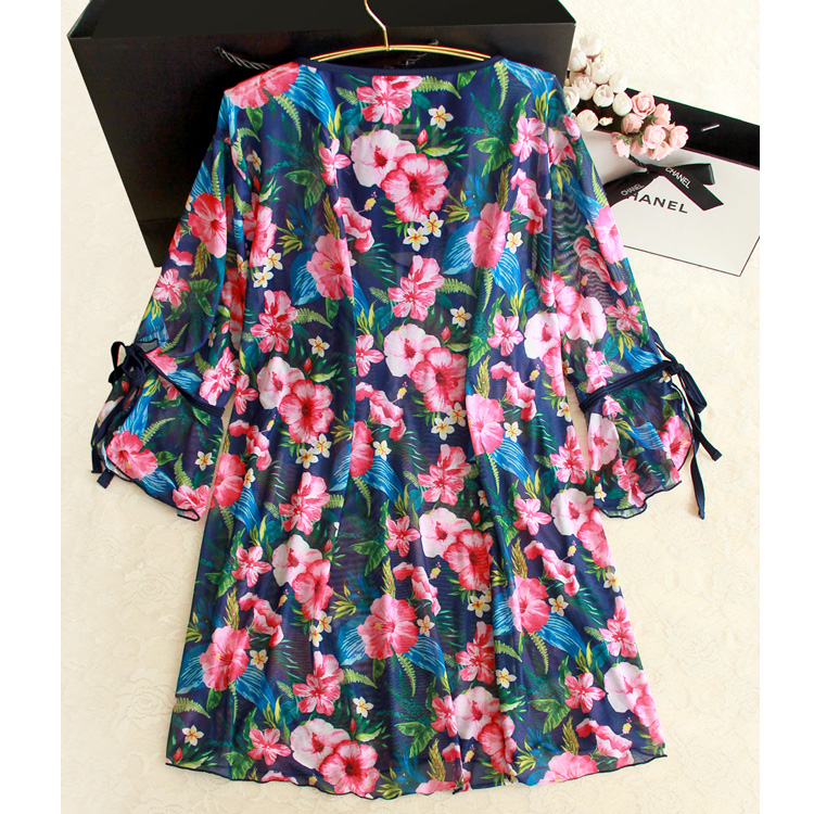 韓國泳衣花卉印花中袖防曬罩衫比基尼三件套小胸聚攏海邊度假泳裝
