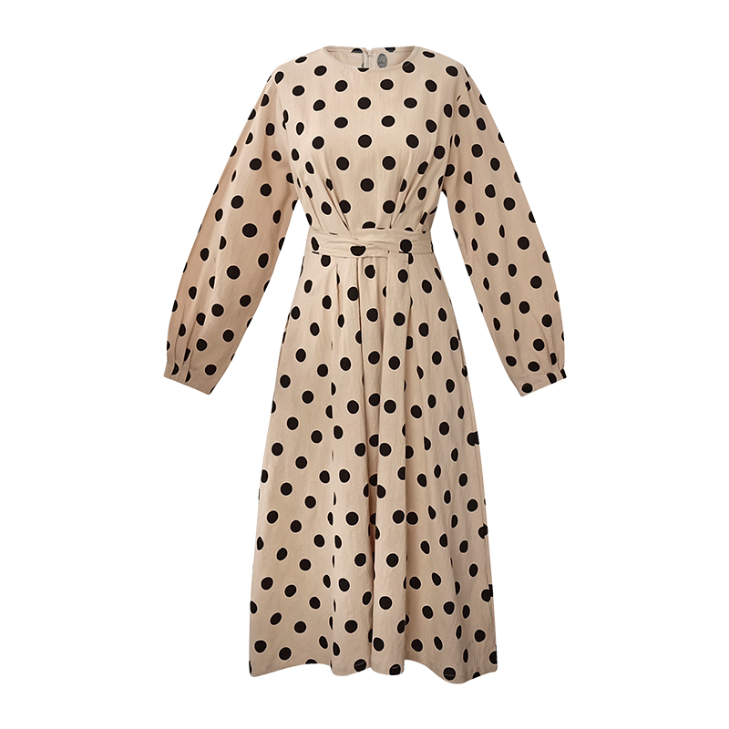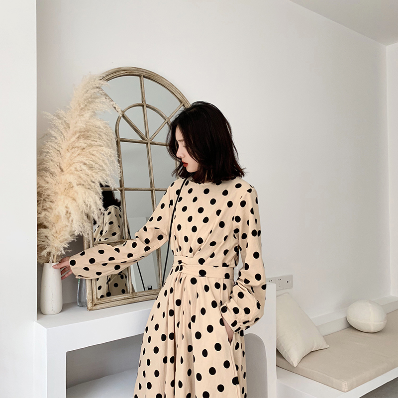 A7seven波點連衣裙女春秋裝系帶韓版長袖圓領A字仙女大擺過膝長裙