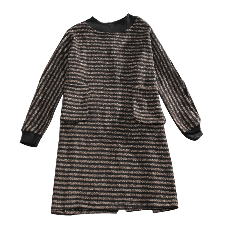 秋冬韓版學院風條紋雙口袋寬松長袖中長款針織毛衣連衣裙女