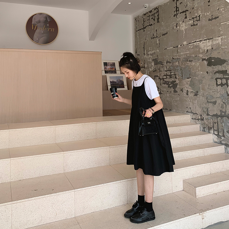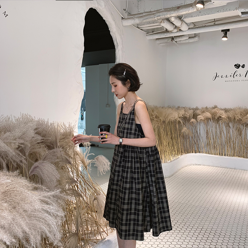 A7seven格子吊帶裙女春夏裝中長款一字領韓版寬松顯瘦大擺連衣裙