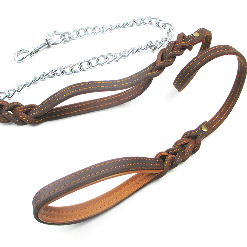 【跨境專供】雙編花牛皮防咬牽引繩 牛皮雙手柄 中大型狗狗訓導繩