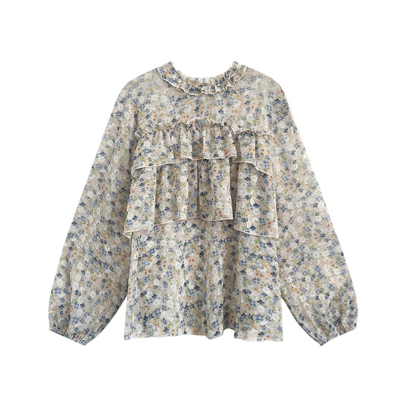 A7seven碎花襯衫女夏雪紡韓版長袖荷葉邊氣質復古洋氣百搭上衣襯