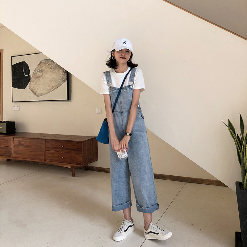A7seven淺色寬松牛仔背帶褲女2019新款春裝薄款純棉水洗做舊長褲