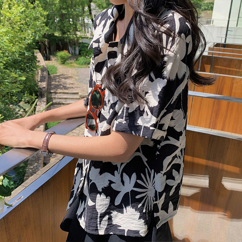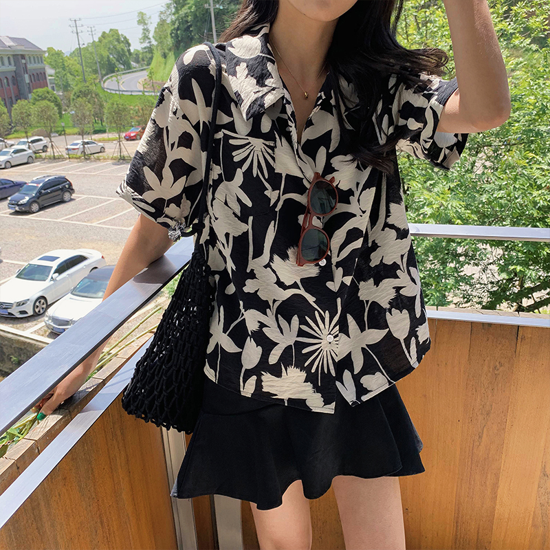 A7seven花紋色襯衫女復古港味夏裝新款短袖韓版寬松開叉黑色襯衣
