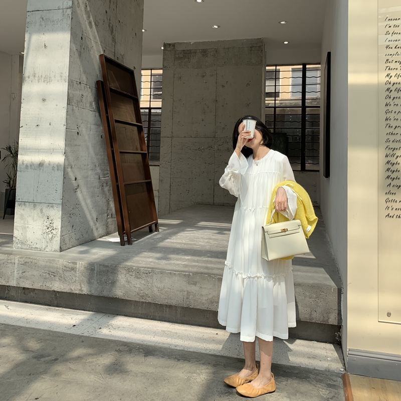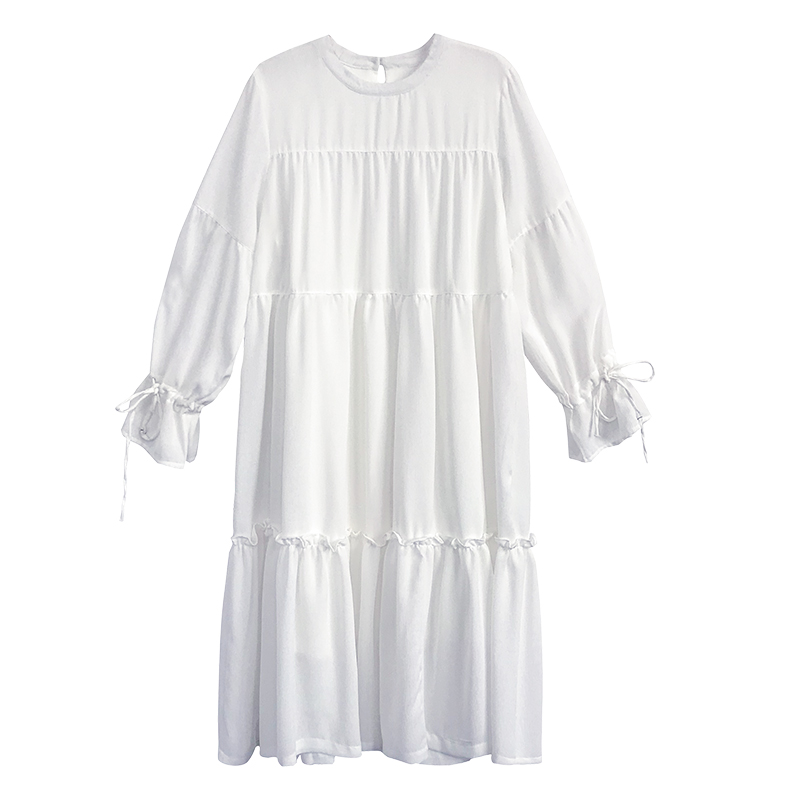 A7seven連衣裙女春夏裝圓領荷葉袖韓版寬松顯瘦白色長款蛋糕裙子
