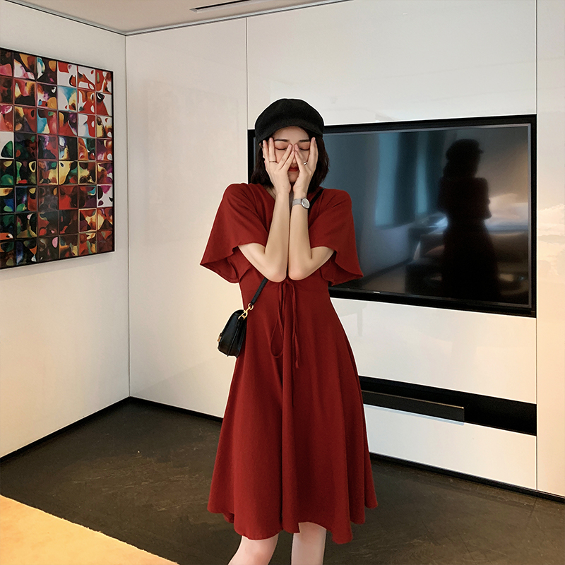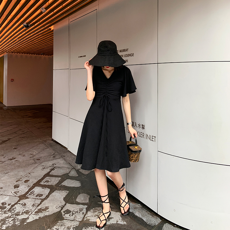 A7seven連衣裙女夏季荷葉袖抽繩系帶中長款高腰短袖V領大擺A字裙