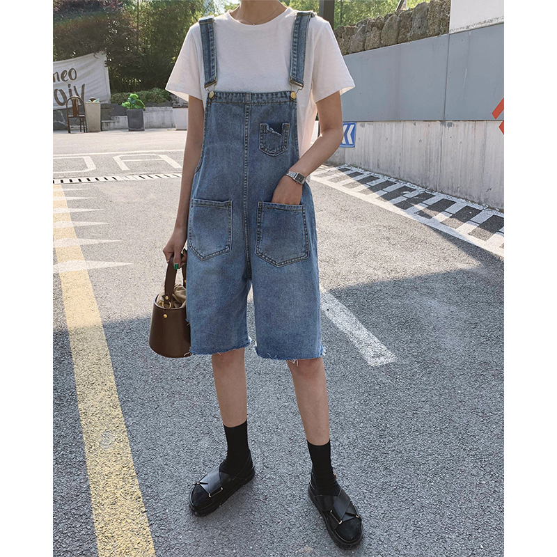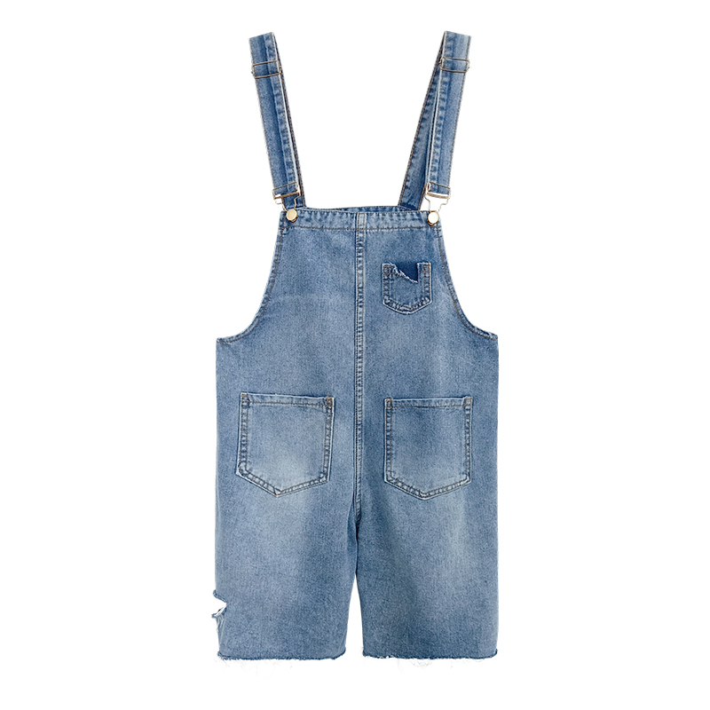 A7seven破洞牛仔背帶褲女2019夏裝新款韓版顯瘦不規則學生五分褲