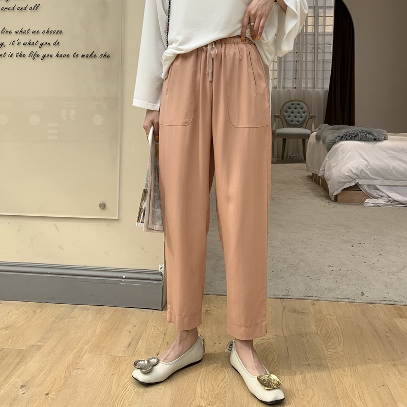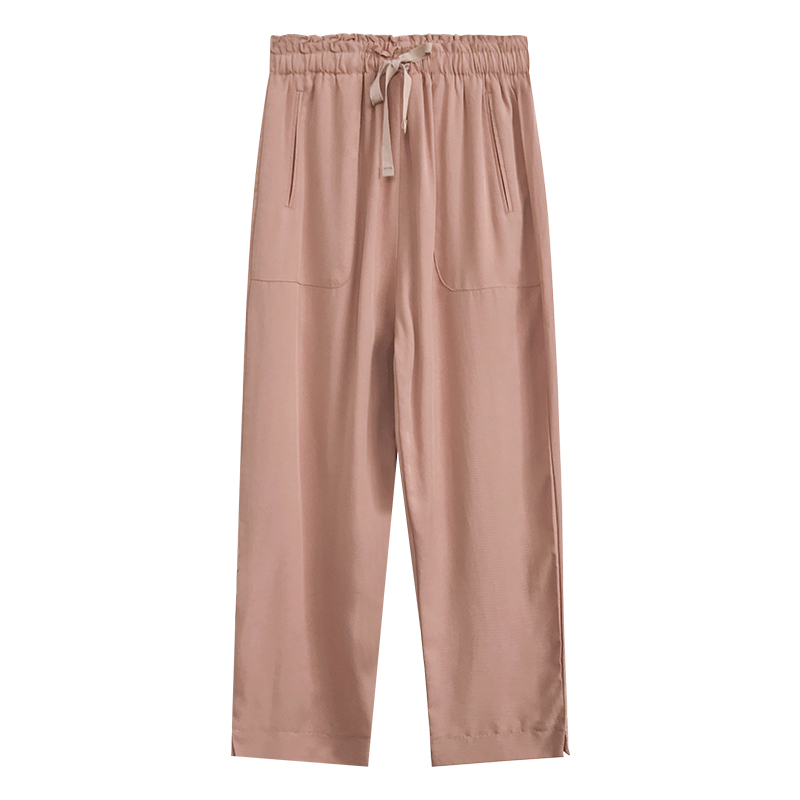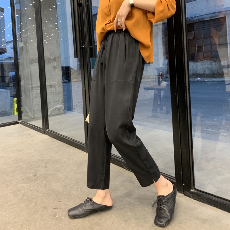 A7seven休閑褲女九分春秋裝新款韓版高腰顯瘦天絲系帶黑色直筒褲