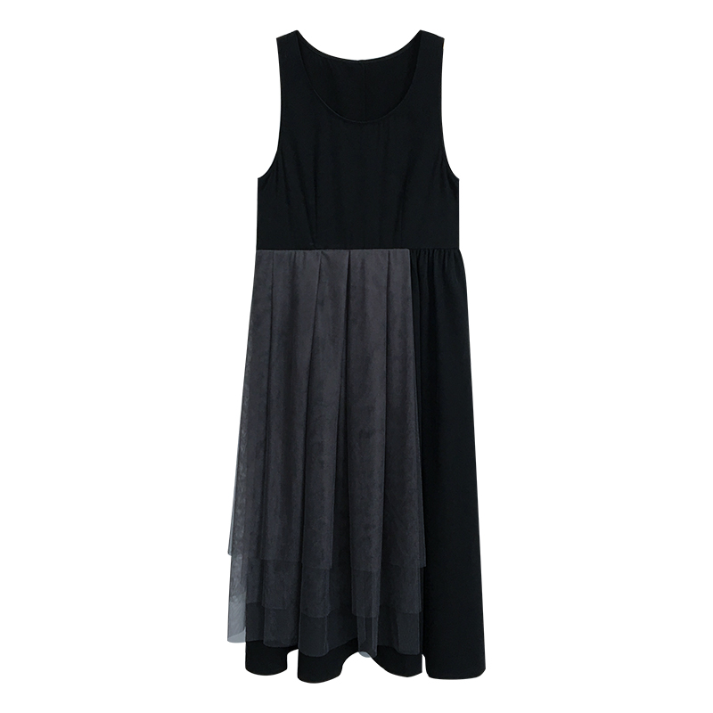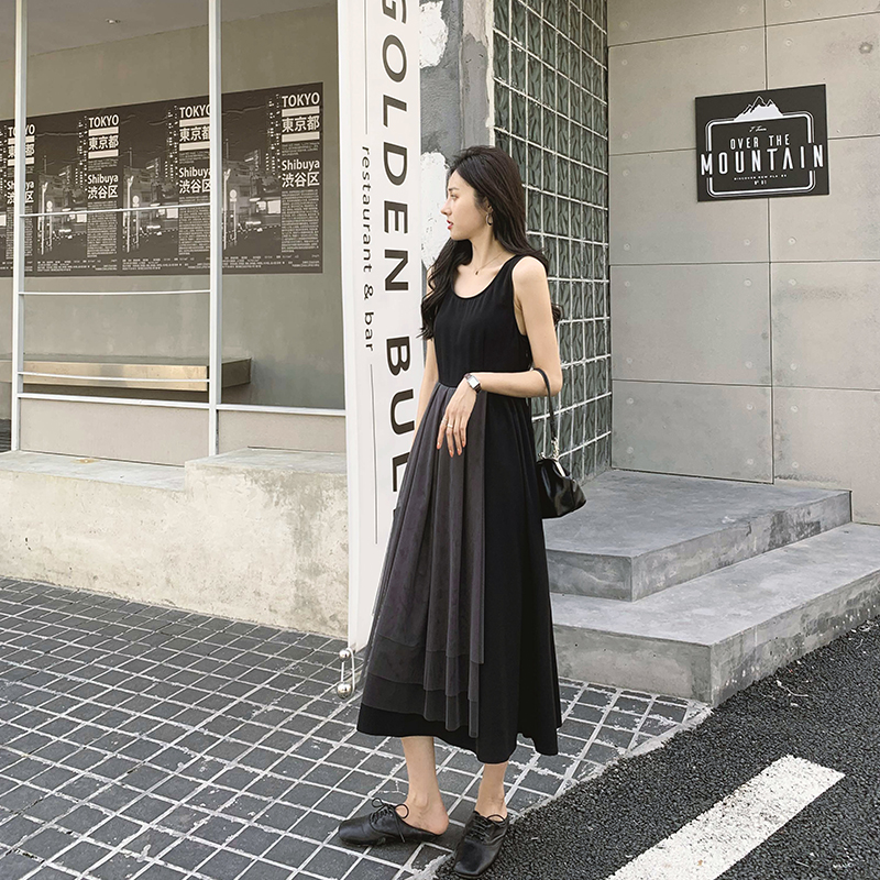 A7seven吊帶背心裙女夏中長款寬松顯瘦不規則拼接網紗A字連衣裙子