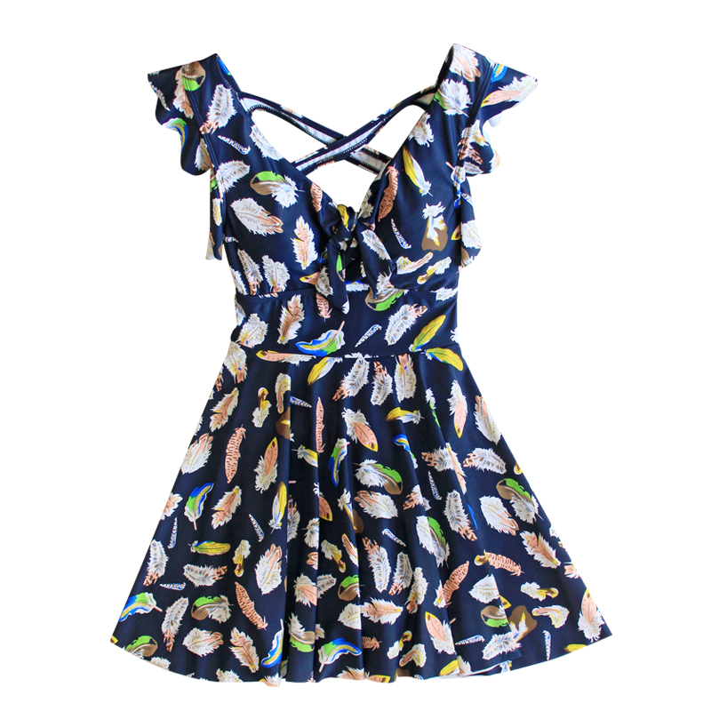 溫泉泳衣女韓國新款連體游泳裝女裙式平角保守遮肚荷葉邊羽毛印花