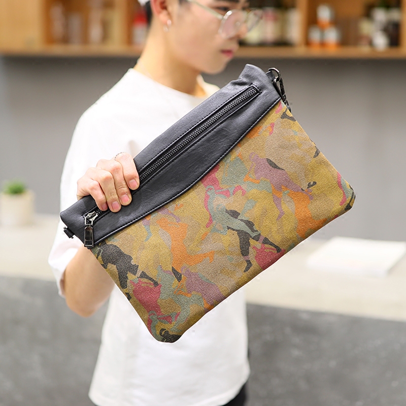 新款男士手拿包復古迷彩人帆布配皮手包韓版男包單肩斜跨包