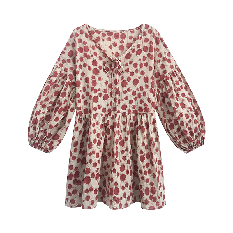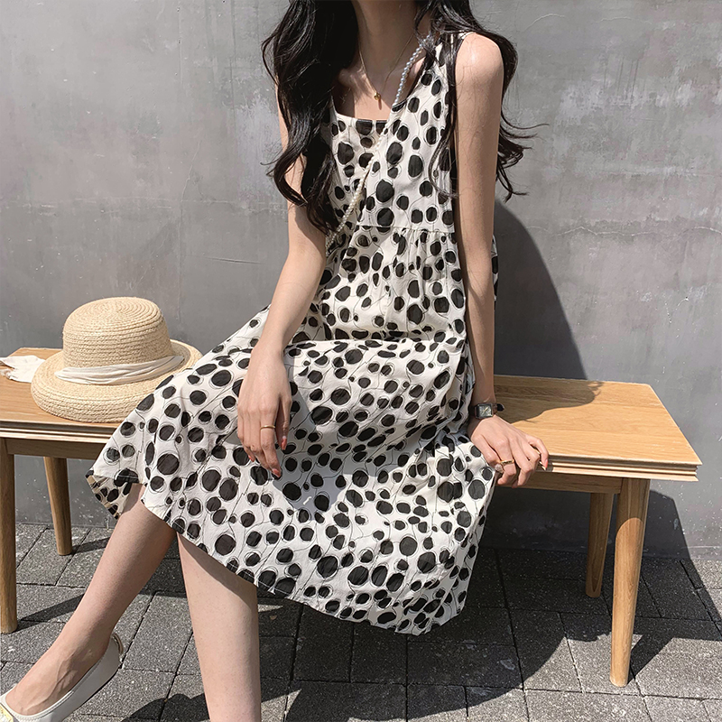 A7seven背心無袖連衣裙女夏季棉麻韓版顯瘦圓點V領荷葉邊A字裙子