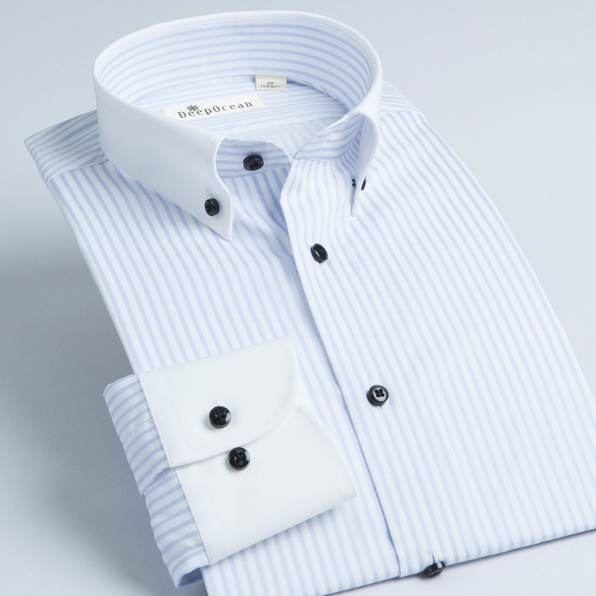 / 襯衫長袖修身男士藍灰粉色商務細條紋純棉修身秋秋釘扣領男裝襯衣
