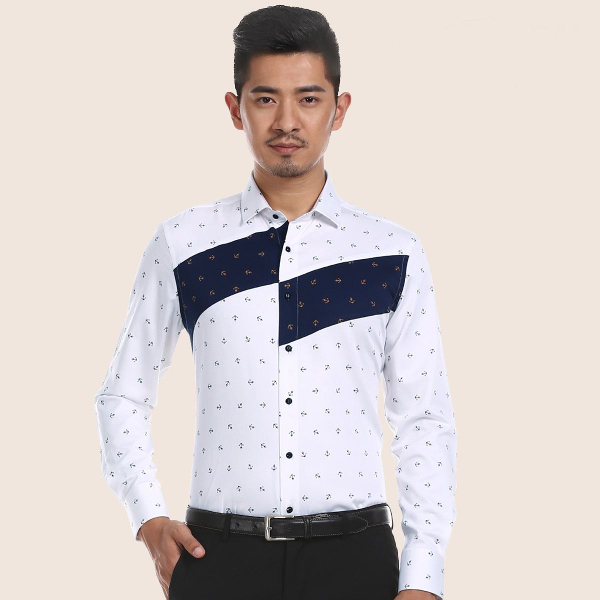 深海男士個性長袖襯衫時尚斜裁拼接印花休閑絲光棉純棉英襯衣秋款