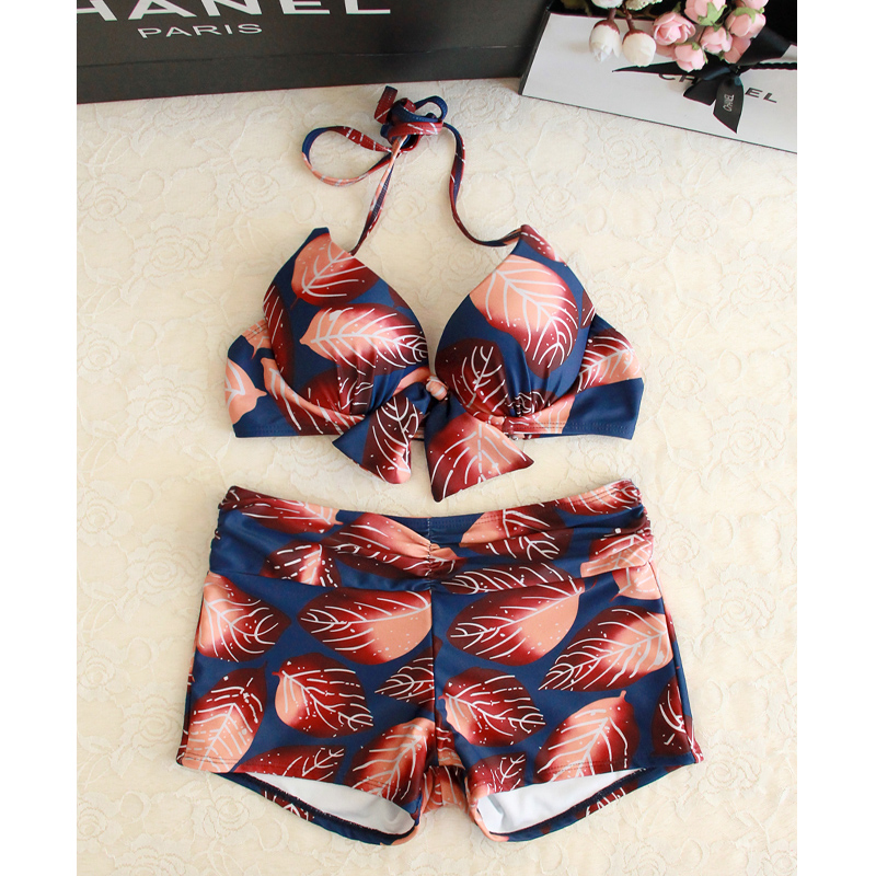 海邊度假少女溫泉泳衣女比基尼三件套保守平角荷葉邊遮肚聚攏顯胸