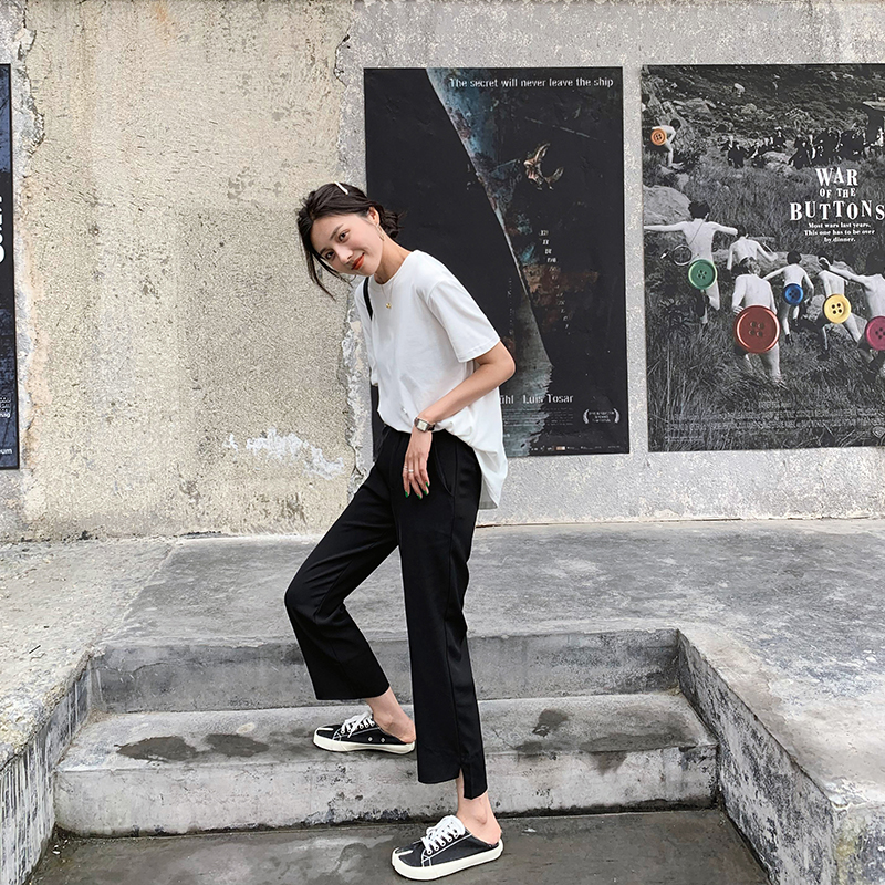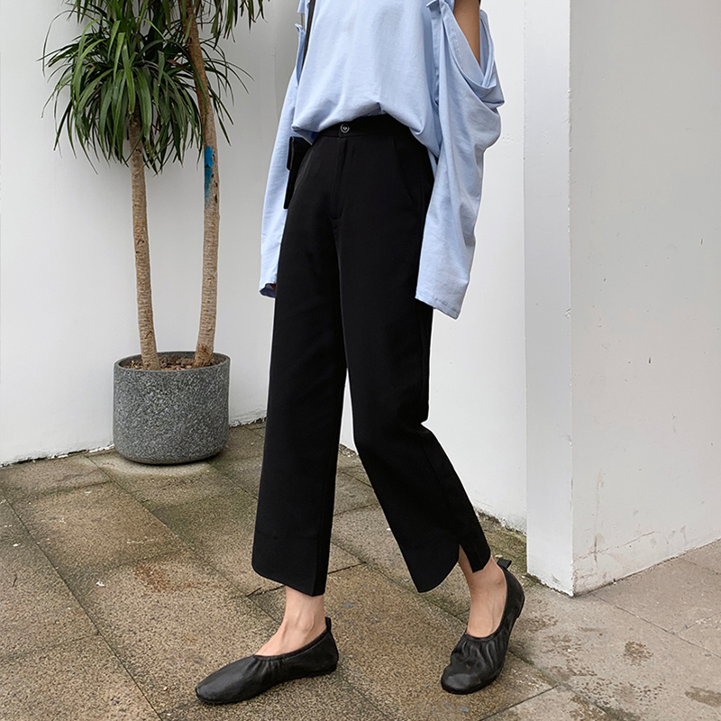 A7seven西裝褲女九分夏韓版高腰顯瘦黑色腳口不規則休閑直筒褲子